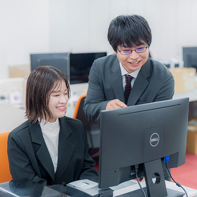 配属後は先輩がトレーナーとしてマンツーマンで指導します。いつも近くで見守り、支えてくれるので安心感があります。不安を少しずつ自信に変えながら、実践的なスキルを習得できる環境です。